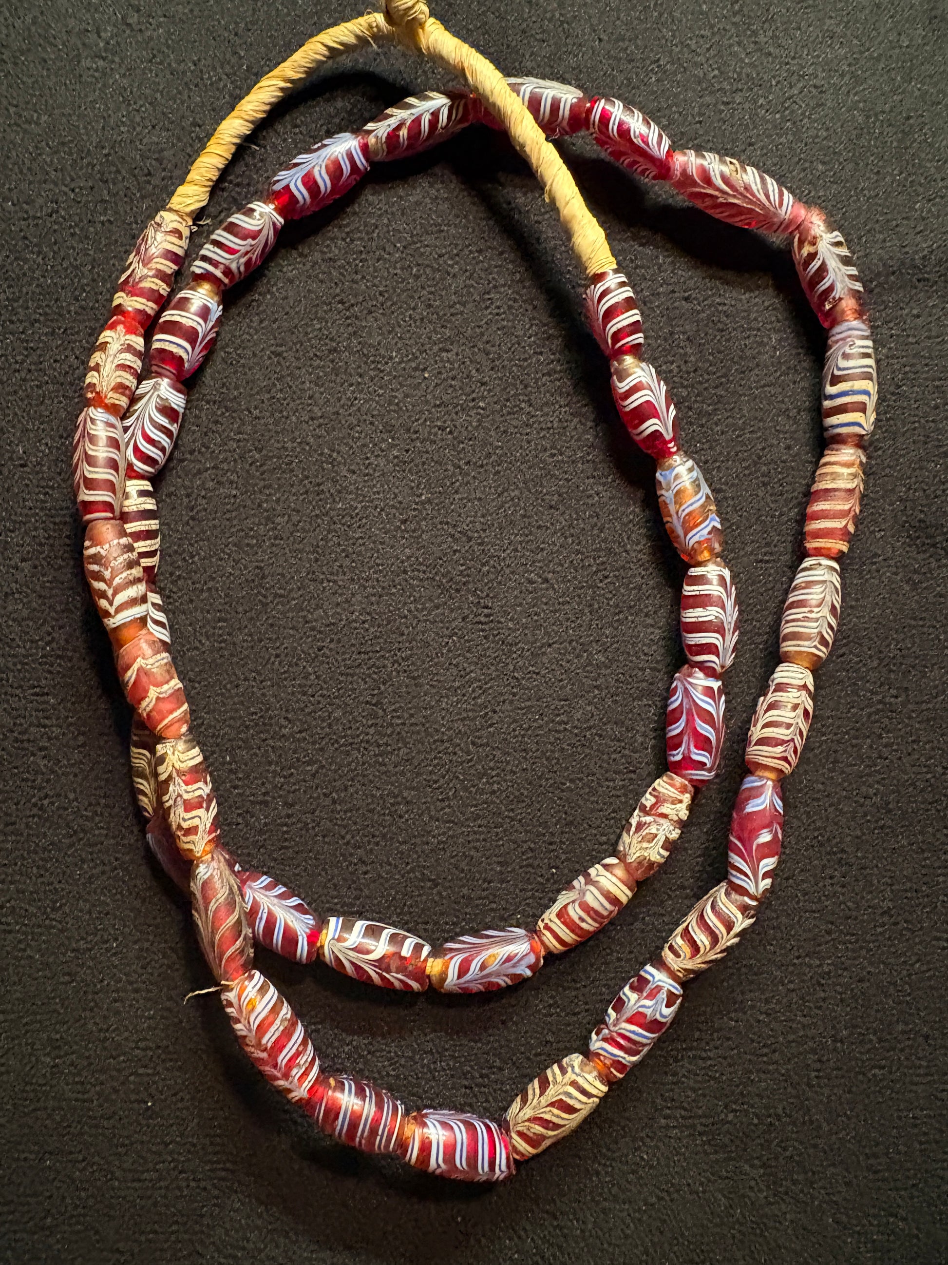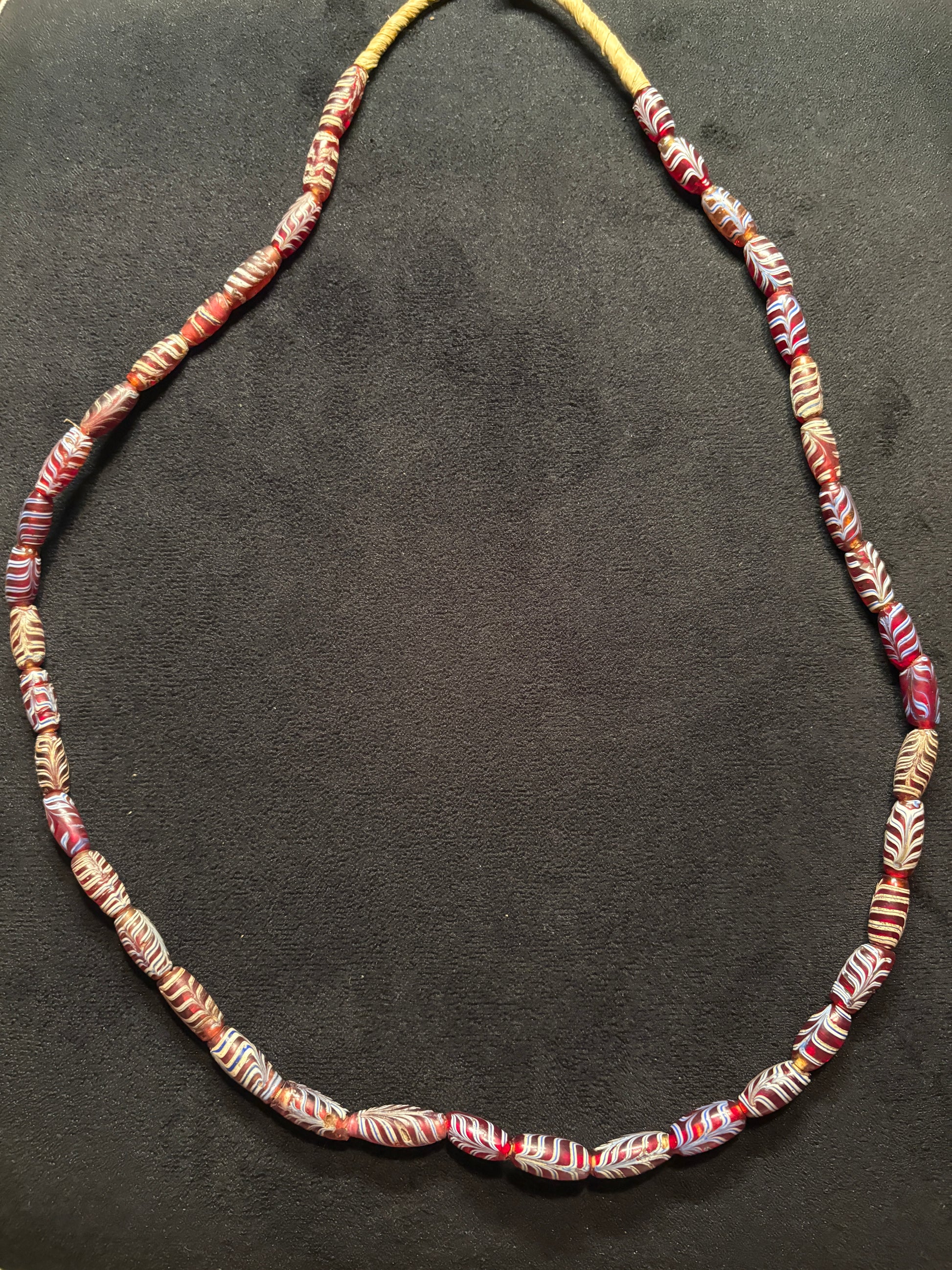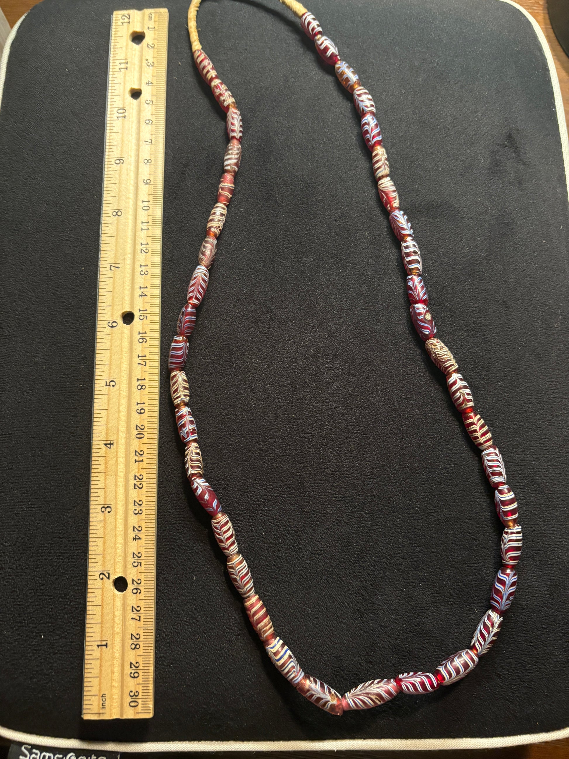 Antique Venetian African Trade Bead Necklace - Red Feather Beads 29" [BR0010)